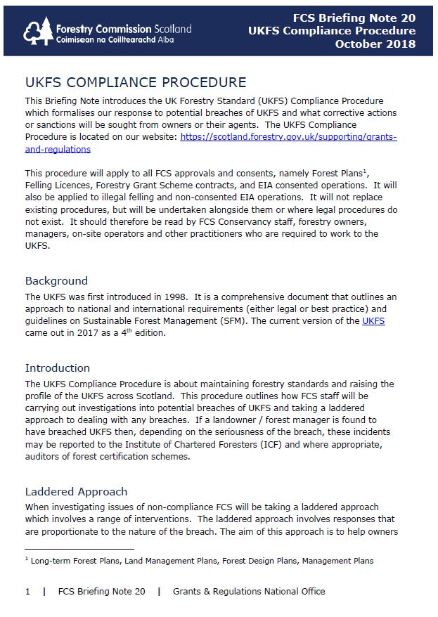 Briefing Note 20: UKFS Compliance Procedure Last updated :13 Apr 2026 Topic: Apply for a grant This briefing note introduces the UK Forestry Standard (UKFS) Compliance Procedure which formalises our response to potential breaches of UKFS and what corrective actions or sanctions will be sought from owners or their agents. Summary Procedure is located on our website: https://scotland.forestry.gov.uk/supporting/grants-and-regulations Briefing Note 20: UKFS Compliance Procedure PDF | (118.78 KB ) This file might not be suitable for users of assistive technology. Please contact us to request an alternative format. Share this page with others Copy link Email LinkedIn Facebook X formerly Twitter