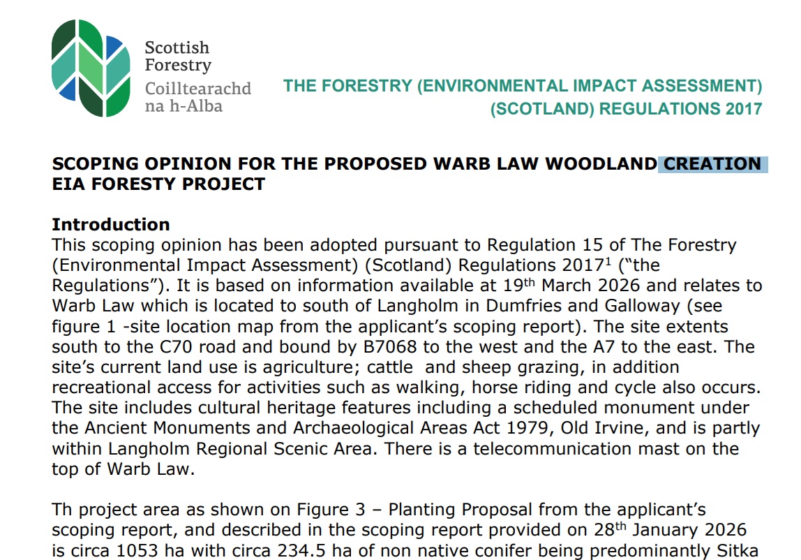 The scoping opinion outlines the environmental issues that must be assessed in the Environmental Impact Assessment for the proposed Warb Law woodland creation project, identifying key topics such as landscape, ecology, ornithology, hydrology, socio‑economic impacts, wildfire risk and timber transport, while also confirming which matters can be addressed through UK Forestry Standard guidance; it sets expectations for surveys, mitigation, cumulative impact assessments, and project design, ensuring the final EIA Report provides sufficient detail to evaluate the project’s likely significant environmental effects.