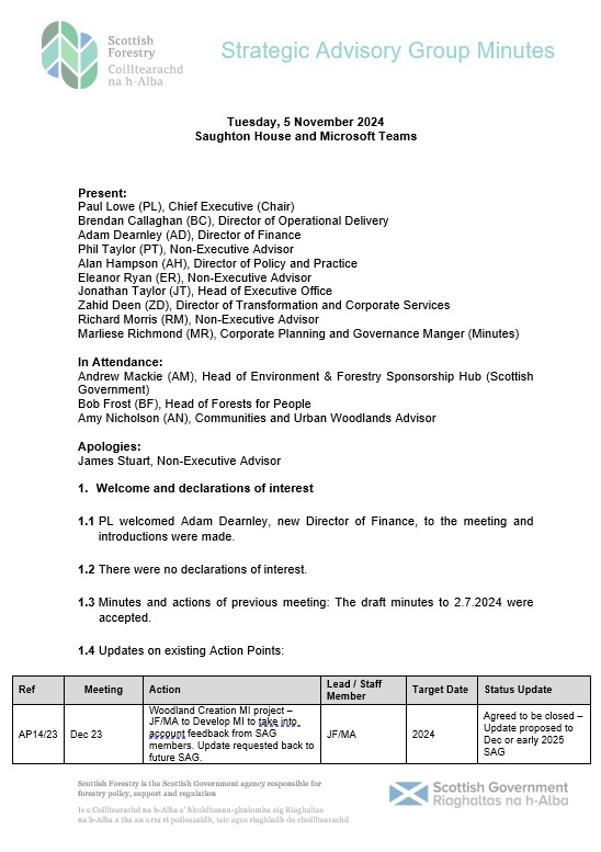 Strategic Advisory Group minutes 5 November 2024 Last updated :13 Apr 2026 Topic: About The SAG meeting held at Saughton House and via Microsoft Teams brought together senior leaders and advisers to discuss strategic priorities, operational updates, and future planning. Summary The SAG meeting held at Saughton House and via Microsoft Teams brought together senior leaders and advisers to discuss strategic priorities, operational updates, and future planning. CEO UpdateUK Budget Implications: Potential funding changes due to removal of ring-fenced status for agricultural and rural payments.Stakeholders are seeking clarity on forestry funding.Tax Relief Changes: Inheritance tax adjustments may affect agricultural and business assets.Tree Health: No further findings of Ips typographus beetles; enhanced monitoring to continue for three years.Business Services: The Evolving Business Services Programme concluded successfully. Strategic Advisory Group minutes 5 November 2024 DOCX | (248.04 KB ) This file might not be suitable for users of assistive technology. Please contact us to request an alternative format. Share this page with others Copy link Email LinkedIn Facebook X formerly Twitter